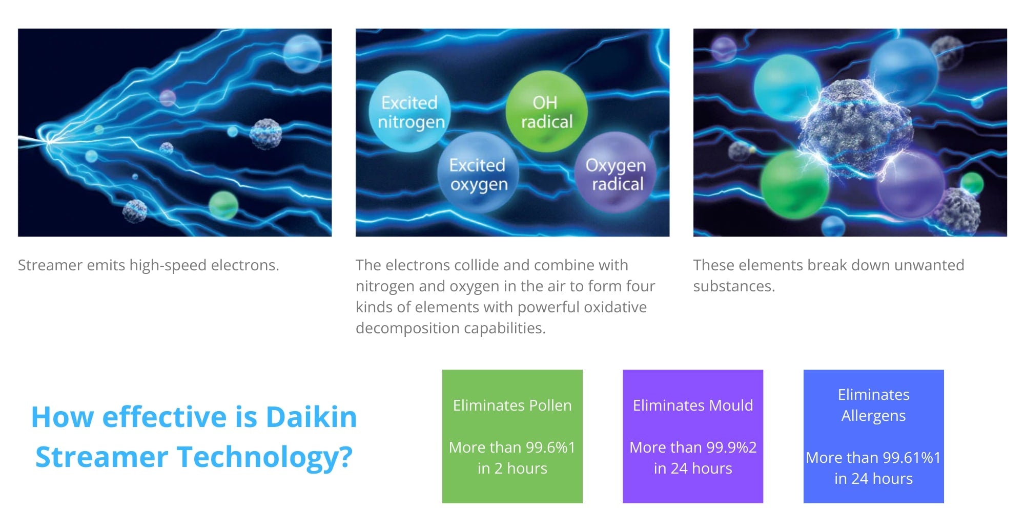 The secret to high performance air purification is Daikin's Streamer Technology. This innovative technology features a high-power plasma discharge that generates high-speed electrons to decompose harmful substances.
