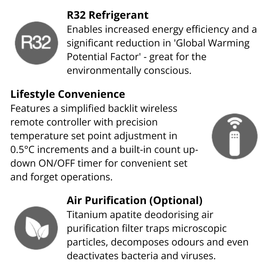 Featuring a contoured matte white flat panel design, intelligent eye, whisper quiet operations and an easy to use controller.
